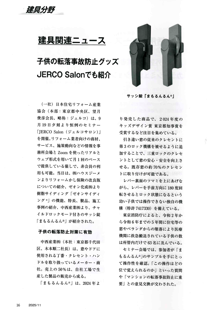 住宅業界専門誌『住宅ジャーナル』2025年11月号に、弊社の見守り製品『まもるんるんⓇ』が掲載されました。子どもの転落防止、安心・安全な住まいづくりを支えるサッシ錠として、業界からも注目を集めています。ぜひご覧ください。
